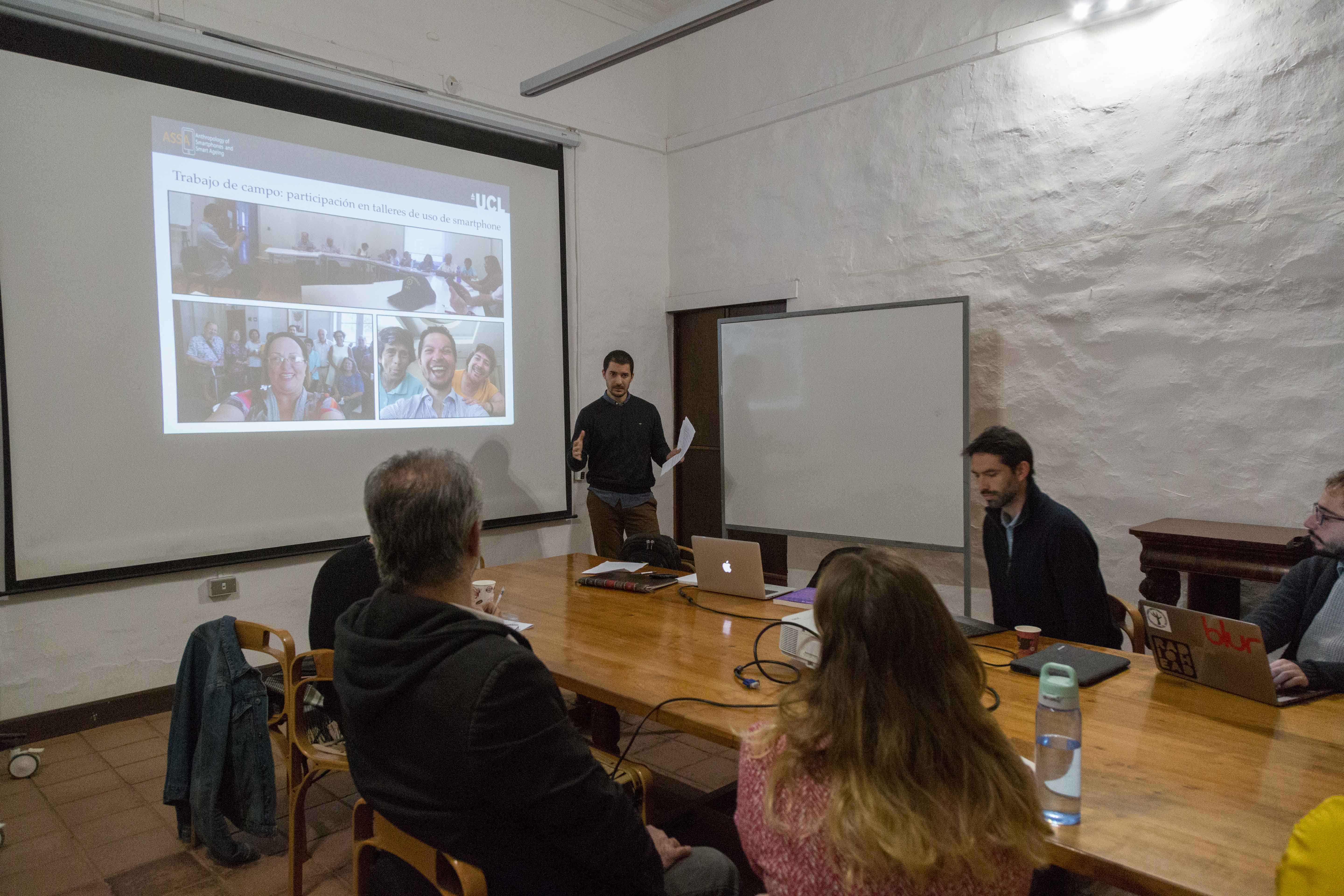 Alfonso presentó hallazgos de su trabajo de campo en Santiago, titulado “adultos mayores y el smartphone: una inminente migración digital”. Esta problemática se inserta desde una valoración contemporánea a la cultura de la juventud, en la cual se le entrega un estatus al “mantenerse joven”.  Para Alfonso, el desafío de realizar una etnografía sobre smartphones y envejecimiento implica la necesidad de una etnografía offline para comprender el uso online y mundano de esta tecnología. La inmersión en el trabajo de campo llevó a Otaegui a realizar voluntariado en cursos de alfabetización digital, los cuales forman parte de una política pública.  En el trabajo de campo, los investigadores de ASSA se encontraron con una gran diversidad en experiencias de adopción de tecnologías, en definitiva “No hay una vejez, hay vejeces” y diversos factores afectan esta experiencia (como el conocer la simbología de otros dispositivos como el símbolo play, etc.) y diferentes motivaciones para adoptarla.