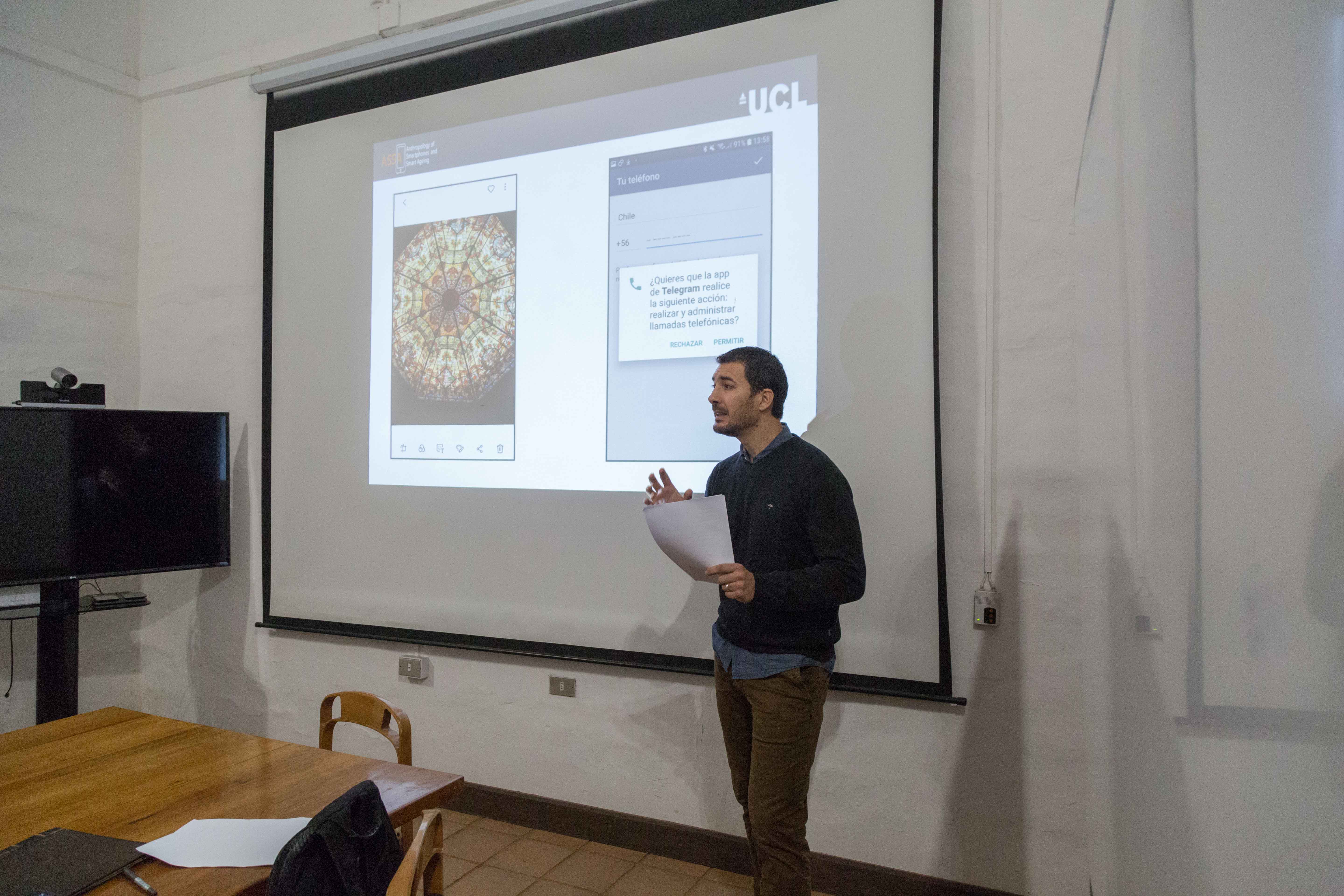 El proyecto cuenta con un equipo de diez antropólogos que realizan etnografías simultáneas de 16 meses en un total 10 países, entre los cuales se incluye Chile. El objetivo es realizar un análisis comparativo del impacto del smartphone en la mediana edad a nivel global y considerar las implicaciones para el uso de aplicaciones móviles en saludo (mHealth). Luego de su presentación, abrió la discusión Sebastián Lehuedéperiodista de la Universidad Católica que cursa actualmente el doctorado en “Datos, Redes y Sociedad” en el Departamento de Medios y Comunicaciones de la London School of Economics. Su área de investigación se centra en la dimensión política de los datos, para la cual combina estudios de ciencia y tecnología (STS) y teorías críticas.