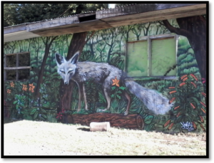 Figura 2: Ilustración del zorro como cazador en un hábitat idealizado. Su mirada amenazante en el límite de la naturaleza lo representa como miembro y guardia de una naturaleza libre de la influencia humana.