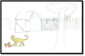 Figura 3: Dibujo de un estudiante de enseñanza básica de la escuela local. En esta escena, el color hace del gato guiña y la gallina muerta protagonistas. El autor adopta la posición de un narrador externo, distante del gallinero recién asaltado y de los dos protagonistas de la escena, como cuando se ilustra una historia.