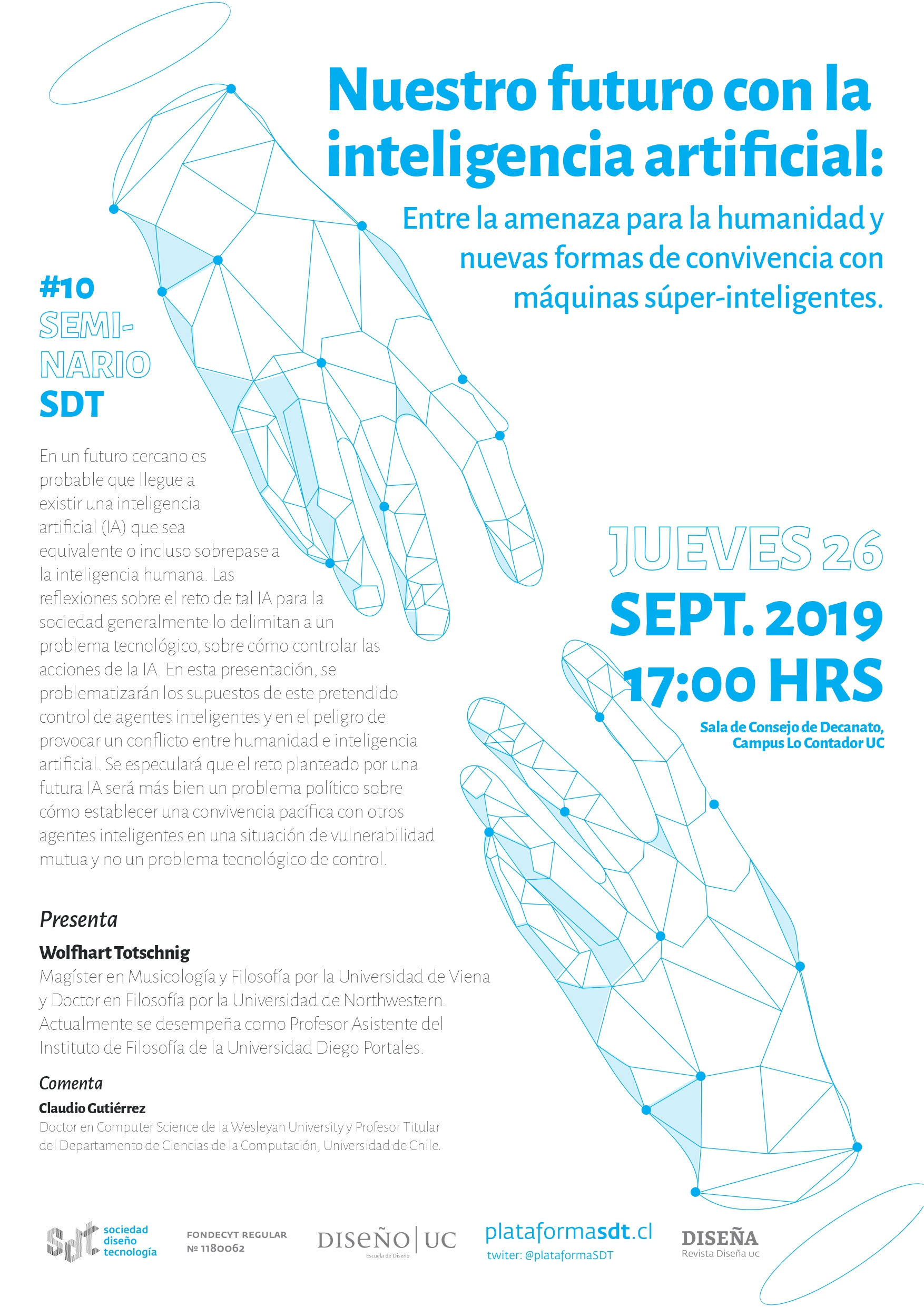 Les invitamos cordialmente a la décima sesión del seminario abierto Sociedad, Diseño y Tecnología (SDT). Este seminario busca abrir espacios de encuentro interdisciplinario, en dónde se presentan y comentan investigaciones, proyectos o intervenciones sobre temáticas ligadas al diseño y tecnología en su más amplio espectro, con especial énfasis en los dispositivos, algoritmos y datos digitales que median nuestra vida contemporánea.La décima sesión del seminario se realizará el jueves 26 de septiembre de 2019, a las 17:00 en la Sala de Consejo de Decanato del campus Lo Contador PUC, Santiago. Contaremos con la presentación de Wolfhart Totschnig, titulada: «Nuestro futuro con la inteligencia artificial: Entre la amenaza para la humanidad y nuevas formas de convivencia con máquinas súper-inteligentes». Wolfhart es Magíster en Musicología y Filosofía por la Universidad de Viena y Doctor en Filosofía por la Universidad de Northwestern. Actualmente se desempeña como Profesor Asistente del Instituto de Filosofía de la Universidad Diego Portales. Comentará la presentación Claudio Gutiérrez, quién aportará una mirada más histórica desde la computación. Claudio es Doctor en Computer Science de la Wesleyan University y Profesor Titular del Departamento de Ciencias de la Computación de la Universidad de Chile.