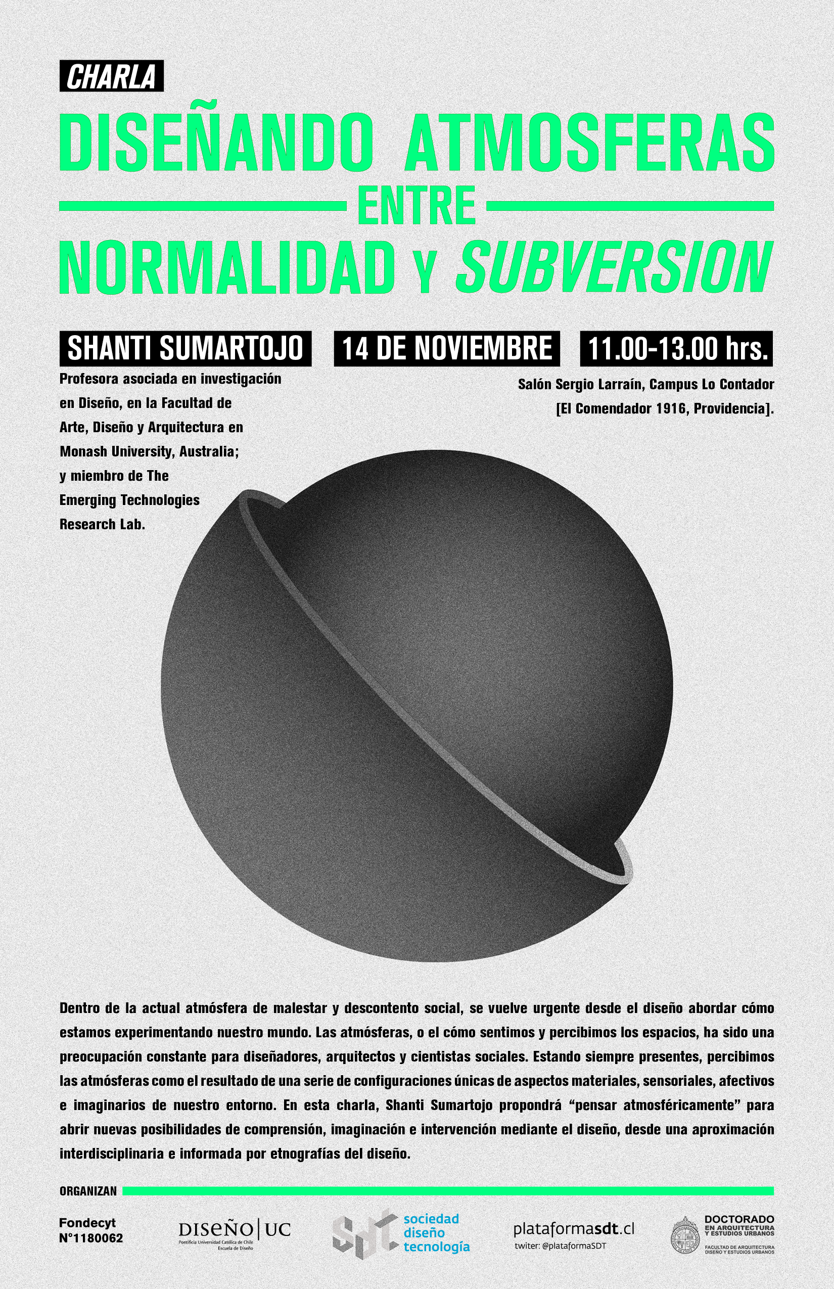 Les invitamos a la charla abierta de nuestra invitada internacional Shanti Sumartojo, titulada “Diseñando Atmósferas: Entre normalidad y subversión”. Esta se realizará el próximo jueves 14 de noviembre de 2019, 11AM en el Salón Sergio Larraín del Campus Lo Contador, Pontificia Universidad Católica de Chile.Resumen de la charla: Dentro de la actual atmósfera de malestar y descontento social, se vuelve urgente desde el diseño abordar cómo estamos experimentando nuestro mundo. Las atmósferas, o el cómo sentimos y percibimos los espacios, ha sido una preocupación constante para diseñadores, arquitectos y cientistas sociales. Estando siempre presentes, percibimos las atmósferas como el resultado de una serie de configuraciones únicas de aspectos materiales, sensoriales, afectivos e imaginarios de nuestro entorno. En esta charla, Shanti Sumartojo propondrá “pensar atmosféricamente” para abrir nuevas posibilidades de comprensión, imaginación e intervención mediante el diseño, desde una aproximación interdisciplinaria e informada por etnografías del diseño.