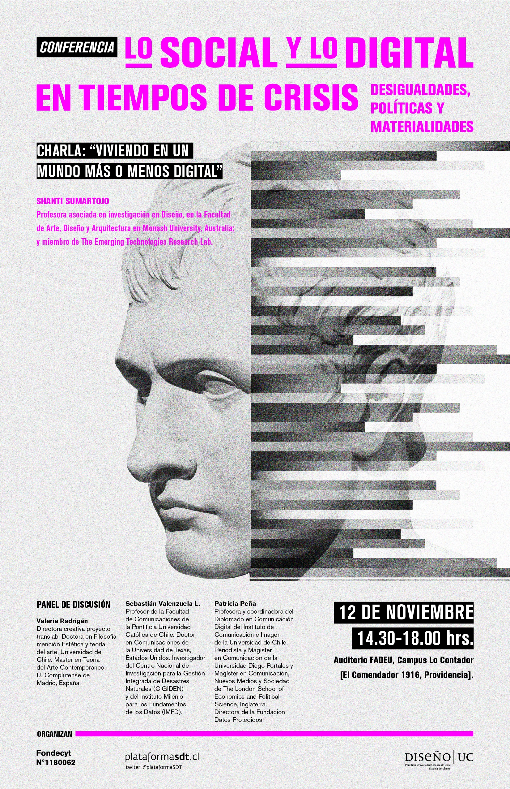 Lo digital ha sido pieza clave en la primavera o despertar chileno de las últimas semanas, desde la organización de las marchas, los memes y videos compartidos por WhatsApp, la reproducción de desigualdades y la precarización laboral, las lecturas de la opinión pública mediante Twitter hasta las propuestas de apropiación o solucionismo tecnológico. Esto habla de la creciente digitalización de nuestro mundo, volviéndose necesario considerar cómo lo digital está moldeando la vida social contemporánea. Por eso, hemos aprovechado la visita de nuestra invitada internacional Shanti Sumartojo, para organizar una conferencia abierta en que podamos reflexionar sobre cómo el descontento social ha sido mediado, provocado y reconfigurado por lo digital desde sus múltiples aristas.Les invitamos cordialmente, entonces, a la conferencia “Lo social y lo digital en tiempos de crisis: desigualdades, políticas y materialidades”. Esta se realizará el martes 12 de noviembre de 2019, entre las 14:30 a 18:00, en el Auditorio FADEU del Campus Lo Contador, Pontificia Universidad Católica de Chile.