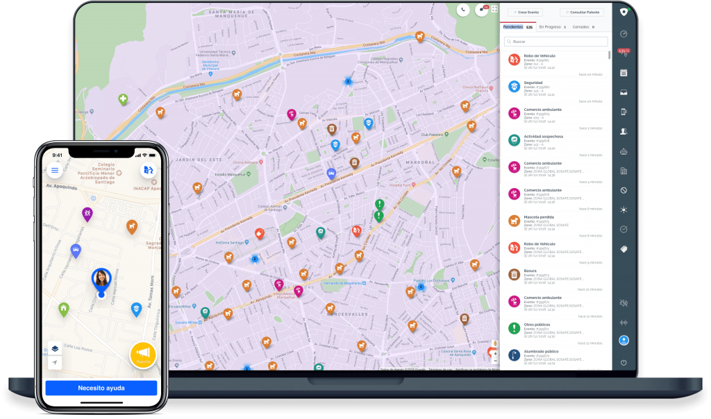 Imagen 2: presentación de la app para smartphones y el dashboard de las municipalidades para gestionar reportes. Imagen por SoSafe.