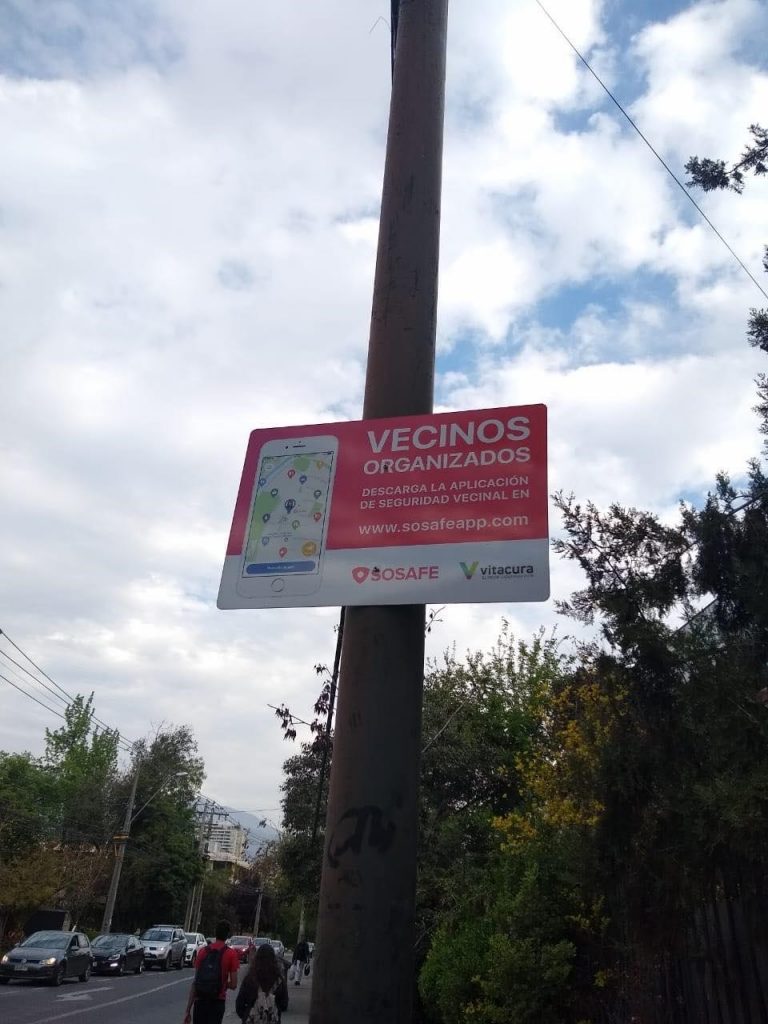 Luego de esta experiencia comienza a identificar ciertas problemáticas: los vecinos no se conocen entre ellos y, por otro lado, no conocen el número de seguridad ciudadana de la comuna. Todos los números de seguridad son de 4 dígitos y comienzan con “14”, pero los dos dígitos finales varían según la comuna y algunos vecinos simplemente llamaban a otra comuna.En principio, la plataforma de SoSafe comenzó a ser utilizada por algunos municipios del sector oriente de Santiago. A la fecha, SoSafe posee más de 400.000 usuarios y conectada a más de 27 municipalidades. La plataforma continúa creciendo en la medida que se difunde más, ya sea al ser recomendada por amigos, juntas de vecinos, o al encontrarnos con publicidad de la app con el mensaje “vecinos organizados”, mientras recorremos diversas comunas (imagen 1).